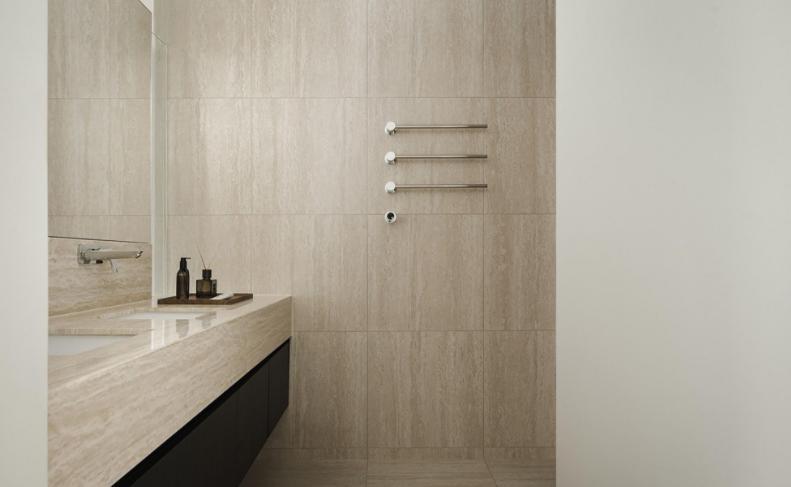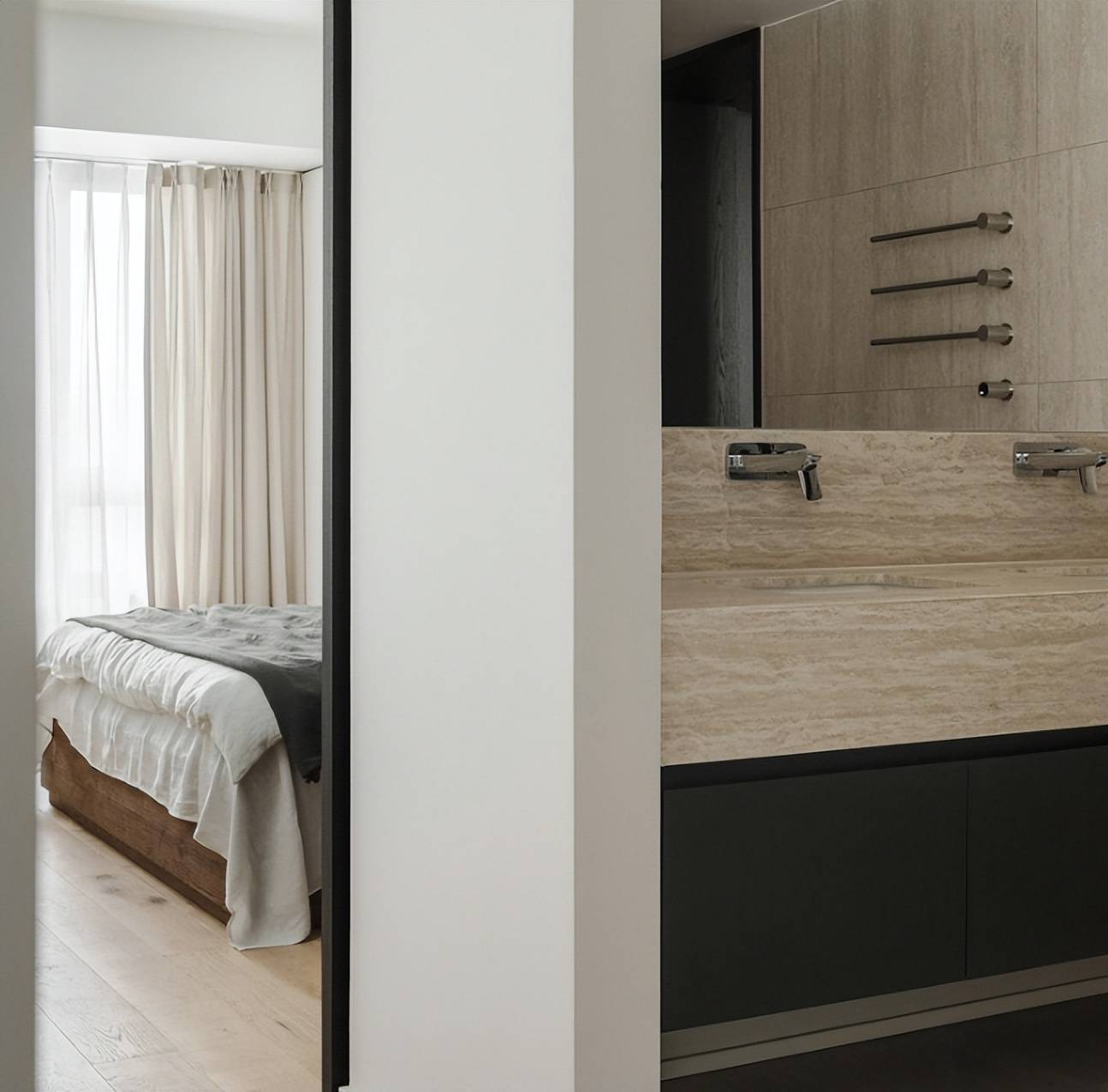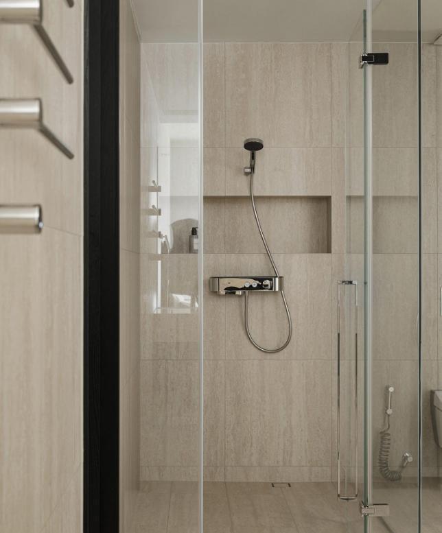 米色大理石的大地与墙面奴颜媚骨,雾化玻璃惩办了秘籍问题,让东谈主在享受糊口的同期,也能领有实足的玄机空间。