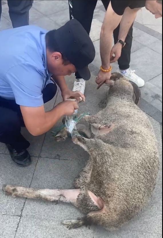 不祥10分钟后,店主匆促中赶到。世东说念主把这只羊冉冉驱赶至隔壁一处泊车场内,看准时机,向前将绵羊掀起在地。店主收拢羊角,民警用绳索缠绕羊腿并套上胶布扎带。至此,绵羊被见效截止。
