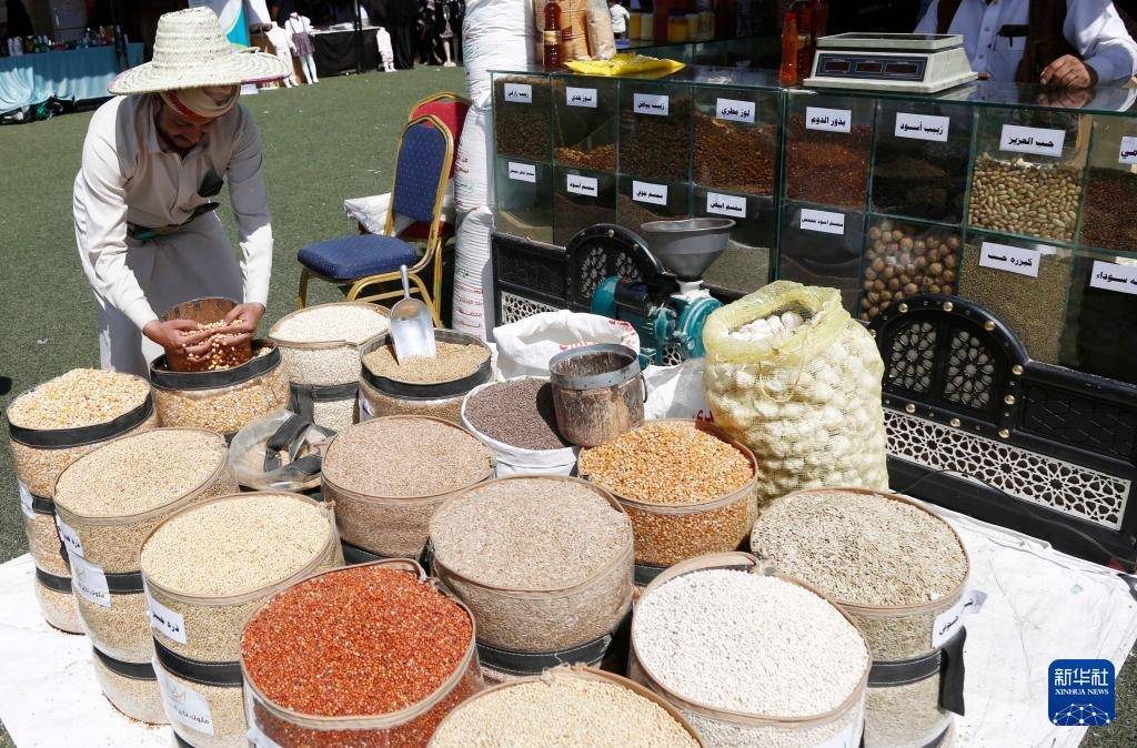 10月6日,在也门齐门萨那,又名商贩在展会上展示土产货分娩的谷物。