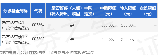 注:(1)凭据法律法例和基金条约的筹谋限定,易方达基金科罚有限公司决定自2025年9月30日起,易方达中债1-3年策略性金融债指数证券投资基金(以下简称“本基金”)A类基金份额和C类基金份额在一齐销售机构暂停机构客户的大额申购及大额退换转入业务,单日单个基金账户在一齐销售机构累计申购(含如期定额投资及退换转入,下同)本基金A类基金份额或C类基金份额的金额不跨越500万元(含)。如单日单个基金账户单笔申购本基金A类基金份额或C类基金份额的金额跨越500万元(不含),则500万元证明申购收效,跨越500万元(不含)金额的部分将证明失败;如单日单个基金账户多笔累计申购本基金A类基金份额的金额跨越500万元(不含)或单日单个基金账户多笔累计申购本基金C类基金份额的金额跨越500万元(不含),则对该类基金份额的苦求按照苦求金额从大到小排序,基金科罚东谈主将逐笔累加至该类基金份额不跨越500万元(含)名额的苦求证明收效,该类基金份额其余苦求金额证明失败。(2)自2025年10月9日起,本基金取消机构客户单日单个基金账户在一齐销售机构累计申购(含如期定额投资及退换转入)本基金A类基金份额或C类基金份额的金额不跨越500万元(含)的舍弃,还原办理大额申购及大额退换转入业务,届时不再另行公告。