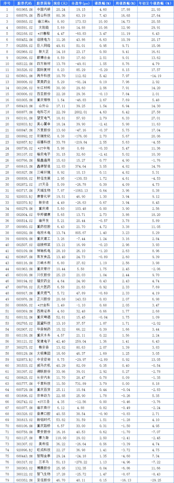 数据流露,79家重庆A股,其中收涨62家,收平1家,收跌16家。