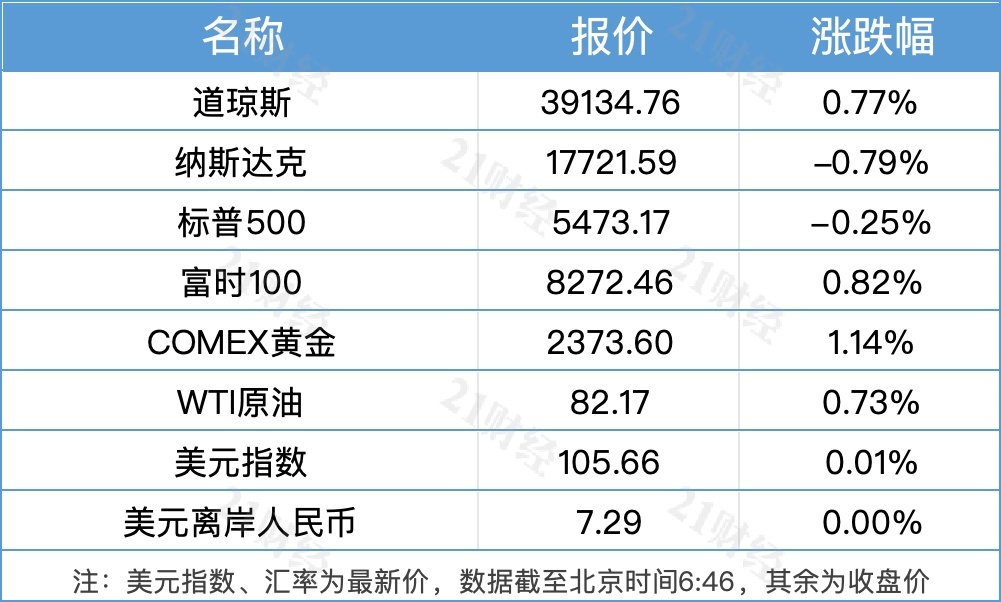1、好意思股三大指数收盘涨跌不一,说念指涨0.77%,标普500指数跌0.25%,纳指跌0.79%。其中,纳指赶走日线7连涨。英伟达跌超3%,总市值3.22万亿好意思元,回落至微软公司之下,略高于苹果公司。欧洲主要股指集体收涨,德国DAX30指数涨0.99%。